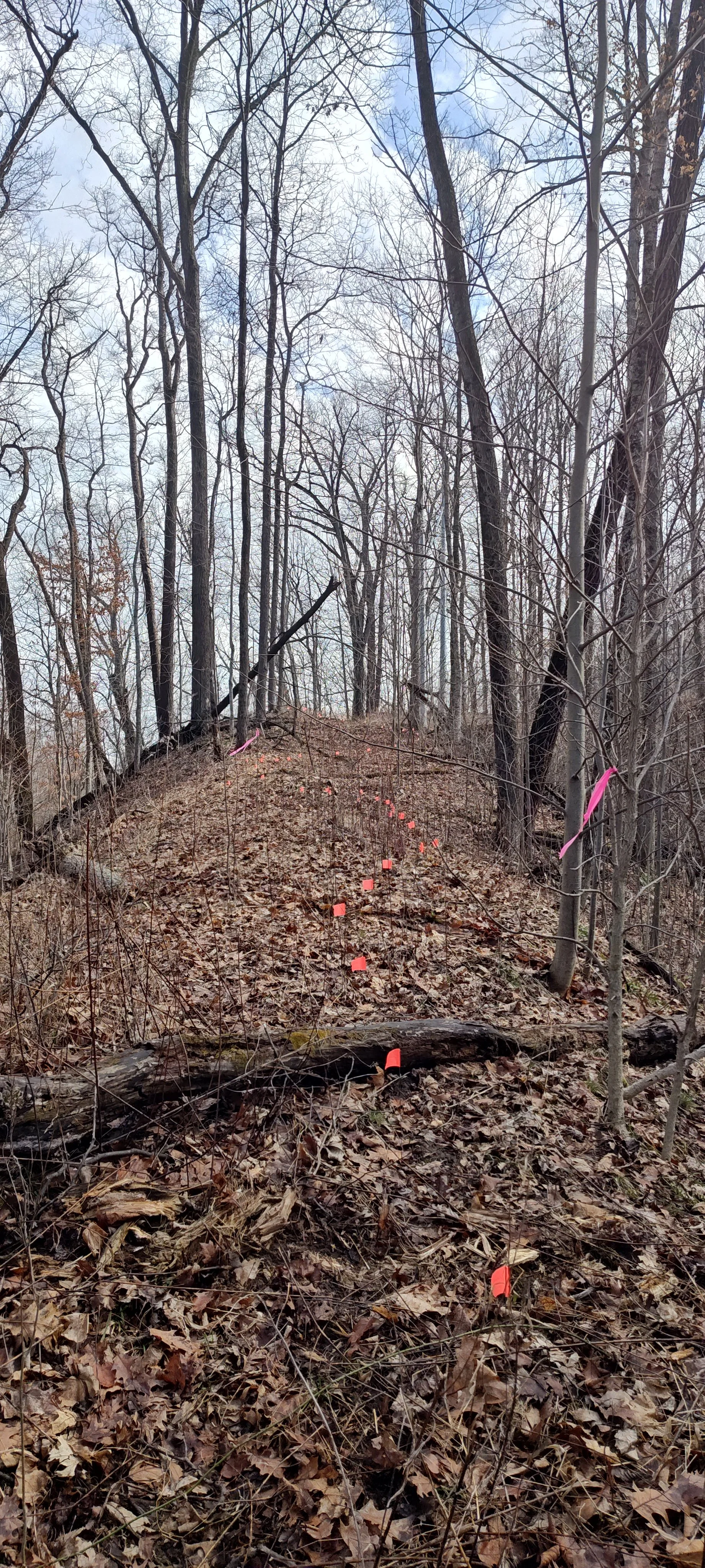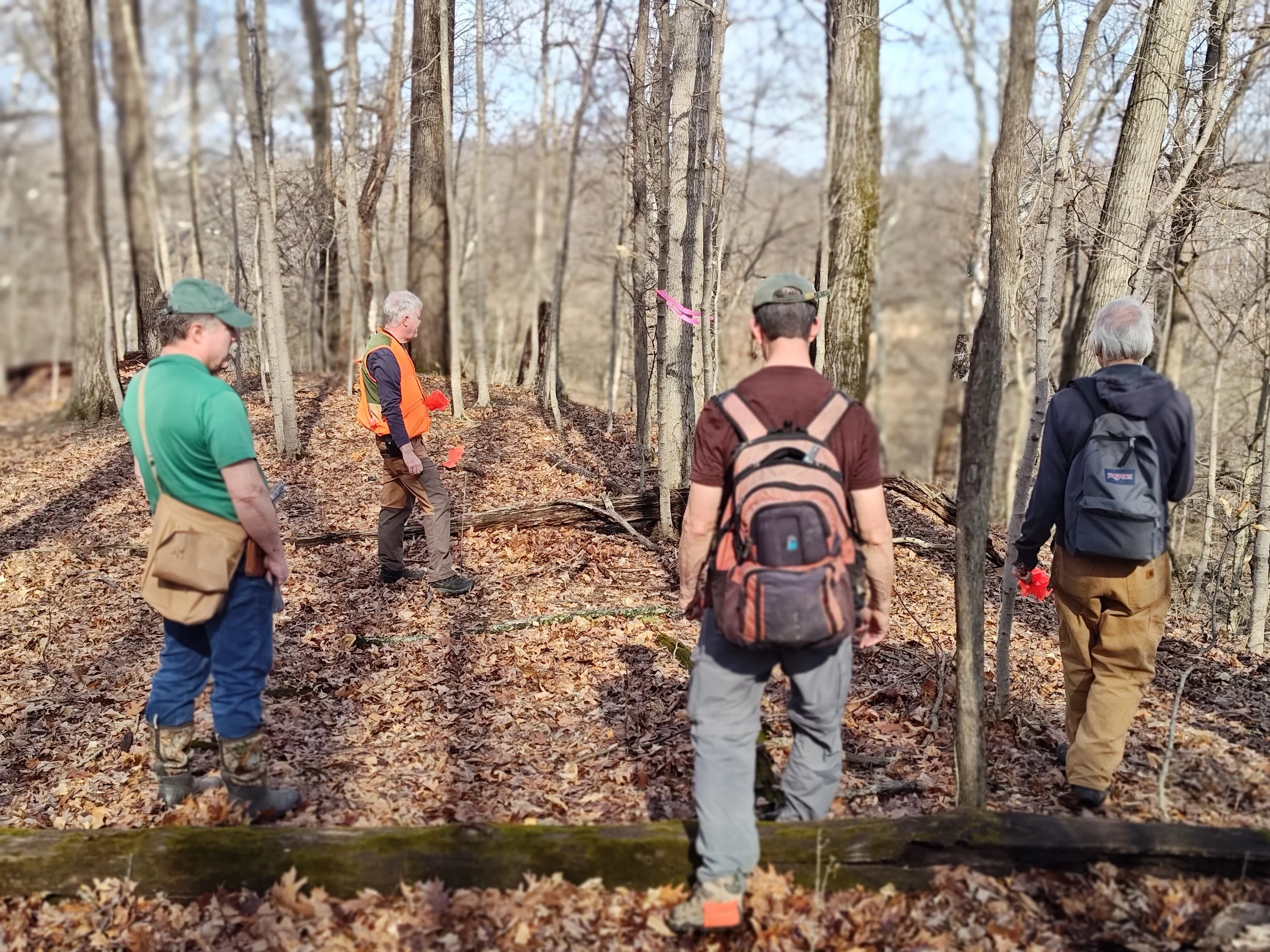 Returning from Bloomington, the Hoosier Hikers Council team worked alongside OLC board members Phil Cox, Brendan Kearns, and Denise Marie Sobieski to continue laying out what will become a thoughtfully designed trail. This second phase focused on precision—carefully flagging the trail route to guide future construction.